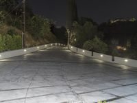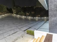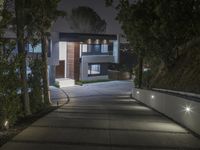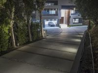 A night view of a residential area in Los Angeles, California, USA, featuring modern architecture, a parking garage, a Mercedes-Benz car, trees, walkways, a street light, and other features of the urban landscape.