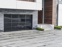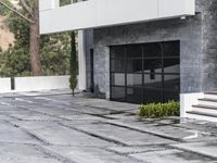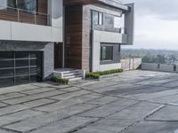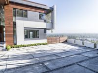 A modern, concrete building in sunny Los Angeles, California, USA. The building has a white facade, with brick and tile flooring, a door, and a paver surface. The building is part of a residential area, and nearby are trees and open spaces. The clear sky and sunshine make this the perfect location for a home or property.