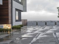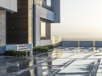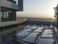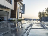 Aerial view of a residential area in Los Angeles, California, USA. The modern architecture of villas and buildings stands out against the grey sky and cobble stone road surface. The open space with its trees, nature and recreational area creates a unique landscape, lit up by the sunlight and reflections in the wet surface.