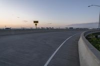 A stunning view of the modern architecture in Los Angeles, California, USA during dawn. The city's skyline is illuminated with clear skies as the sun rises, casting a beautiful light on the asphalt road and surrounding buildings. This urban landscape showcases the calm and urban design of the city, with office buildings, highways, and residential areas seamlessly integrated. The image also captures the entry and exit points, highway ramps, and inclines, along with the Armco barriers and guard rails that ensure safety. The cityscape is complemented by the presence of trees, water, and street lights, creating a serene and vibrant public space within the neighborhood.