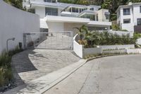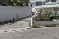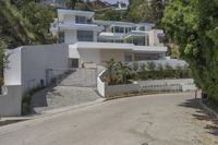 A stunning view of a modern residential building in Los Angeles, California, USA, featuring sleek architecture and a concrete street.