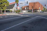A view of the modern architecture in Los Angeles, California, USA, showcasing a residential building in a suburban area with a clear sky and tree-lined streets.