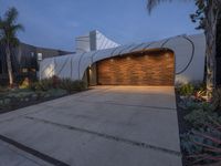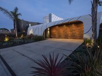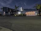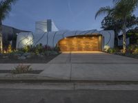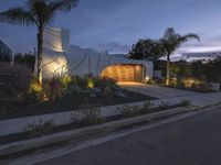 A stunning modern residential building in Los Angeles, California, USA, surrounded by lush green grass and tall palm trees. The clear sky and artificial lights create a futuristic and emotional atmosphere at dawn.