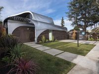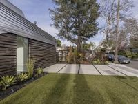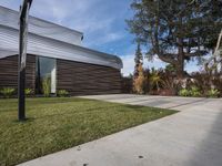 A stunning example of modern architecture in Los Angeles, California, USA. This residential property showcases sleek lines, a grassy lawn, and a futuristic design.