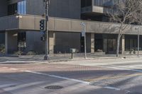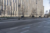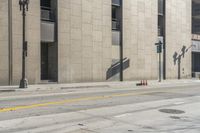 A view of a modern office building in the business district of Los Angeles, California, USA. The building's sleek design and reflective facade stand out against the urban landscape. The city streets are lined with trees, and the road is made of smooth asphalt. The low, concrete curb creates a defined boundary between the sidewalk and the street, while the yellow crosswalk provides a safe passage for pedestrians. The building casts a hard shadow on the ground, adding to the architectural beauty of the city.