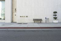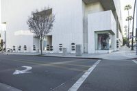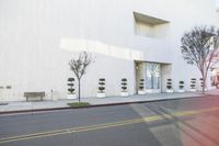 A view of the modern architecture in Los Angeles, California, USA, featuring a residential area with a road, trees, buildings, walls, white facade, window, tile wall, storefront, and public space. The urban design includes a woody plant, infrastructure, concrete, cement, tile, room, furniture, and a landscape of asphalt and a curb.