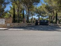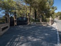 A view of suburban Mallorca, in the Balearic Islands of Spain. A clear sky provides the perfect backdrop to the entry of a modern architecture home, as a profile of the asphalt driveway and nature landscape are illuminated in the daytime.