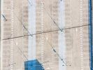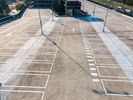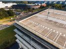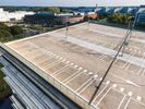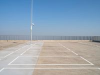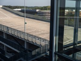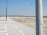 A concrete street in Holland, Netherlands, with a clear sky, asphalt road surface, parking lot, public utilities, modern architecture, and a variety of other infrastructure components. The landscape displays a symmetrical horizon with grass, trees, and wooden fencing.