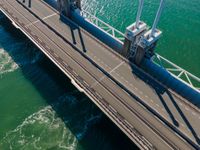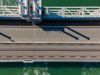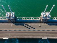 Aerial view of a modern bridge, dam, naval architecture and boat on a lake in Holland, surrounded by a cityscape, road, and ocean. The various structures are made of metal, wood, and pipe, with vehicles and wind turbines creating a scene of water transportation and leisure.
