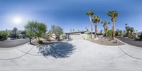 A profile of a modern villa in the suburban residential area of Palm Springs, California, USA, with a parking garage and palm tree in the foreground. The clear blue sky of the Sonora Desert and the mid century architecture of open spaces provide a beautiful backdrop for this day.