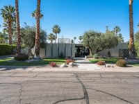 A lush, mid-century residential villa stands out against the clear sky and grass surface of Sonora Desert in Palm Springs, USA, surrounded by a garden and asphalt path. Palm trees provide a profile to the modern architecture of this suburban house.