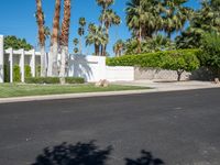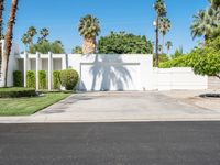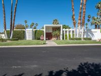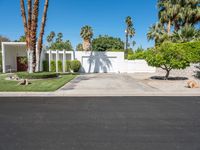 A straight road lined with lush greenery and modern villas in the residential area of Palm Springs, California, USA. A parking garage and driveway of a mid century home is visible in the profile of the entry, with a clear sky above the Sonora Desert.
