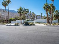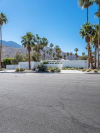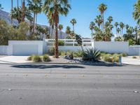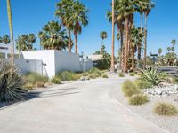 A view of a mid-century residential villa in Palm Springs, California, USA, featuring a driveway, parking garage and modern concrete architecture against a clear sky. A palm tree and paver surface complete the entry of the suburban house.