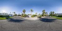 A mid-century villa in the residential suburbs of Palm Springs, California, USA, with a sunny driveway and palm tree in the foreground, and a clear blue sky and sunshine in the background.