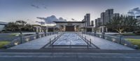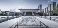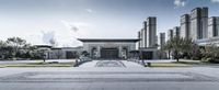 A stunning view of a modern residential villa in Panjin, Liaoning, China, with its sleek design and open space, surrounded by a clear sky and the city skyline in the background.