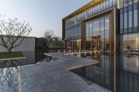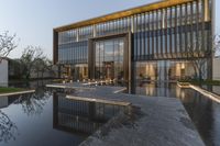 A stunning example of modern architecture in a residential area, with a beautiful reflection on the water.
