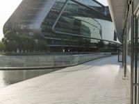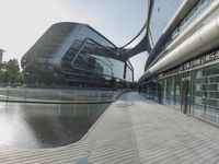 This image shows a modern architecture building in Soho, Shanghai, China, with a bridge, walkway and guard rail, reflecting in the open space courtyard. The structure features a futuristic facade with glass windows, a plaza, and a road surface with the city's metropolitan area in the background, illuminated by the early winter dawn.