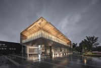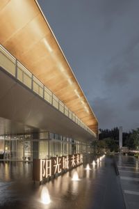 A stunning modern architecture of a residential villa in Shenyang, China, with artificial light illuminating the surface and a clear sky at dawn.