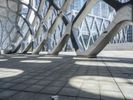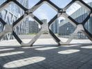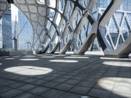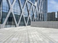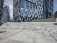 A view of the modern architecture of Shenzhen, China, with its high-rise buildings, glass walls, and reflective surfaces. The city has a mix of urban infrastructure, corporate headquarters, public space, and open plazas, with a clear sky and a paver walkway. Symmetry and futuristic elements make up this metropolitan area.