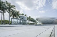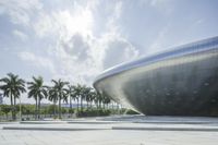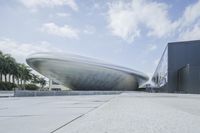 A low-angle shot of a modern architectural building with open space and lush vegetation, located in Shenzhen, Guangdong Province, China, Asia.