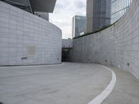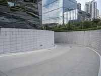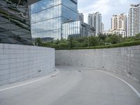 A view of the modern architecture of the city of Shenzhen, Guangdong, China, featuring concrete, asphalt, composite material, walls, roofs, and other structures. The view includes a parking garage, condominium, office building, highway entrance, walkway, and a skateboard park in the metropolitan area.