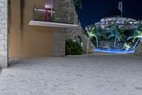 A stunning view of a modern architecture building in Solidaridad, Mexico, illuminated by artificial light at night.