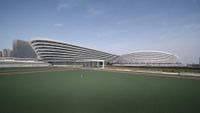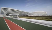 A stunning modern architecture in Suzhou, China, surrounded by lush green grass and open spaces during the day.
