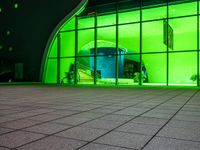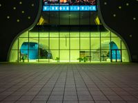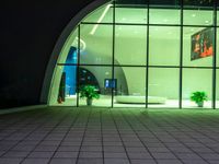 A straight down the road view of a modern paver plaza in Taichung, Republic of China, illuminated by artificial light in the night. The open space theater is illuminated by street lights, providing a unique profile of the city.