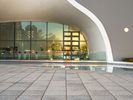 A straight-down view of a modern open plaza in Taichung, Taiwan, with a paver surface and theater in the background. This view is representative of the modern architecture found across the Republic of China and Asia.