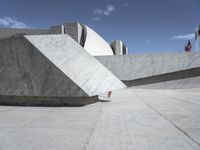 A view of modern architecture in Tenerife, Spain, featuring Brutalist and futuristic architecture in the form of buildings, houses, walls, monuments, sculptures, and pyramids. The materials used include concrete, asphalt, cement, rock, limestone, and pavers, and the landscape features a clear sky, open space, and a sloped road surface. It's the perfect spot for a vacation or day trip, with plenty of infrastructure and vehicles to explore the area.