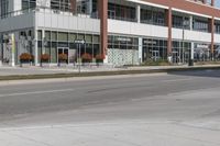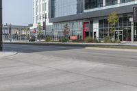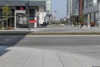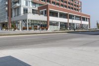 A view of a modern architecture building in Toronto, Canada, showcasing a mixed-use neighborhood with shops and office buildings.