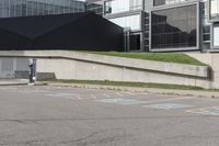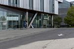 A view of a modern office building surrounded by concrete and asphalt in Toronto's business district under a grey sky.
