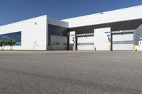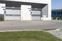 A view of a modern architecture building in Toronto, Ontario, Canada with a low concrete facade. The building is surrounded by an open space with grass and a straight down the road driveway leading to a parking lot.
