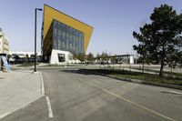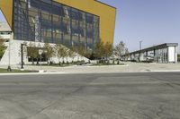 A view of a modern architecture building in Toronto's financial district during the day. The building is located on a busy street with asphalt roads and concrete sidewalks. The facade of the building is made of composite materials and features large windows. A row of trees provides shade along the sidewalk, and there are street lights and crosswalks for pedestrians. The clear sky and urban design create a vibrant city atmosphere.