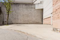 A view of a modern architecture building in Toronto, Ontario, Canada. The concrete structure stands tall against a clear sky, with a grassy courtyard and trees surrounding it. The elevated walkway and low beige walls add to the contemporary design of the building. The hard shadows cast by the sun create a striking contrast on the limestone surface.
