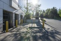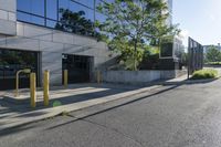 A view of the modern architecture in Toronto, Ontario, Canada, with a clear sky and sunlight shining on the office buildings and residential areas. The city is known for its impressive infrastructure, including well-maintained roads and walkways. The mix of concrete, grass, and trees creates a pleasant urban environment.