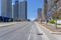 A view of modern architecture in Toronto, Ontario, Canada. The photo shows a high-rise condominium building with glass walls and a glass facade. The cityscape is visible in the background, with clear skies and a straight road leading into the urban neighborhood. The foreground features lush grass, trees, and vegetation. The image captures the essence of urban design and city life in Toronto.