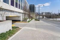 A view of a contemporary residential building with a glass facade in Toronto, Ontario, Canada. The urban design of the neighborhood showcases the city's modern architecture and urban style.
