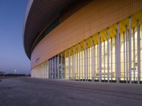 A cityscape of a modern architectural building with a sleek facade and clean lines, illuminated by the soft morning light. The urban design showcases the concrete structure and artificial light, creating a futuristic atmosphere in the business district.