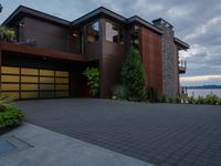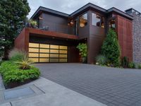 A stunning view of a modern residential property with sleek architecture, surrounded by lush vegetation and a perfectly manicured lawn. The grey sky at dawn adds a touch of gloom to the scene.