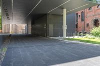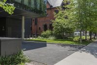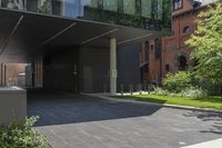 A view of a modern office building in the business district of Toronto, Canada, showcasing its sleek design and straight road entryway.
