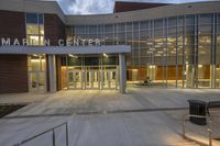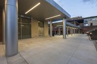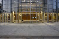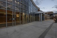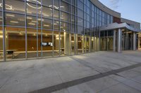 A stunning view of a modern architecture building in a bustling city in the USA during dawn, with a concrete and composite material facade and a sleek glass profile.