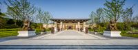 A stunning view of a modern residential villa in Yuyao, Zhejiang, China, with clear skies and artificial lights illuminating the house at dawn.