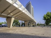 A high-rise office building with a concrete bridge and clear sky in the financial district of Zaragoza, Spain.