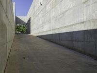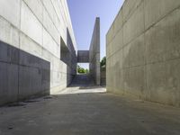 A view of the modern architecture in Zaragoza, Spain, showcasing a low concrete building with a straight road leading to a tunnel. The clear sky and hard shadows create an urban design masterpiece.