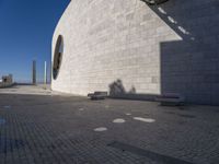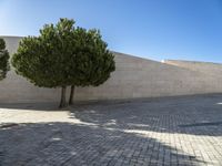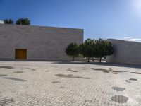 A black-and-white view of an automotive tire and wheel system near a sandstone wall of a house in Lisbon, Portugal. The azure sky and vegetation provide a backdrop to the modern architecture and urban design of the city.
