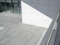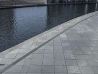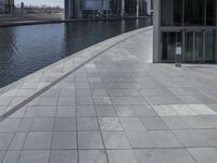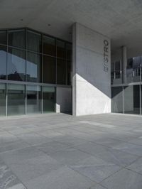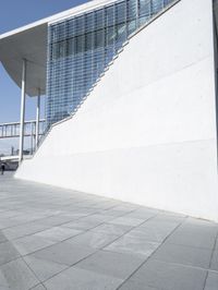 A modern corporate headquarters building in Berlin, Germany with a concrete facade, glass walls, and a reflective surface in the cityscape of the urban design of Germany's capital. The structural element of the building stands out against the blue sky of the day with a top-down view of the business district, a river flowing in the foreground, and trees in the background.