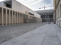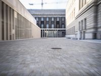 A view of the James Simon Gallery in Berlin, Germany, featuring a mix of modern and classic architecture, cobble stone roads, concrete facades, sandstone columns, and museum windows. Tourists explore the urban design of the city, taking in the motion blur of the passing cars and people as they move down the street.