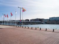 A scenic view of the city of Holland, Netherlands, from a pier in the harbor. The modern high-rise residential area is surrounded by a lake and a coastal line, with a clear sky and sunny day. The horizon is visible with its open space urban design, jetty, road surface, paver, vegetation, flag, and street light, all contributing to the cityscape.