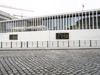 The sun rises over the Berlin skyline as cobblestone roads and modern architecture take shape in the foreground of the museum-filled city. Grey skies over Europe provide a muted backdrop to this urban landscape in Germany.